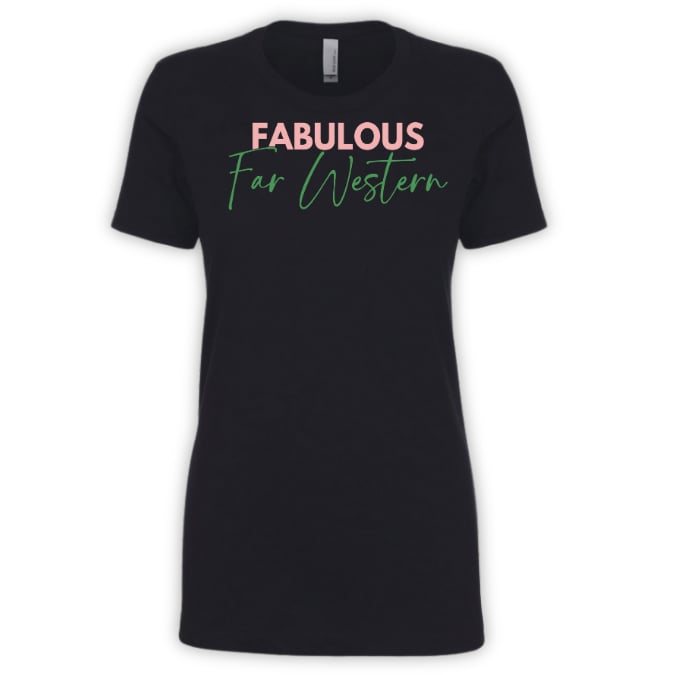 Make a bold yet elegant statement with this tee featuring Fabulous Far Western in signature pink and green lettering. Simple, stylish, and effortlessly chic, this shirt is designed to celebrate sisterhood and the region with confidence and flair.