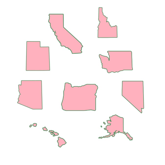 Alaska • Arizona • California • Hawaii • Idaho • Nevada • Oregon • Utah • Washington